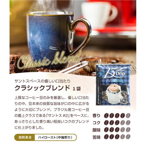 | 内容量 | ●澤井珈琲オリジナルマグカップ 1個(赤または、白) 容量:300ml ●ドリップバッグコーヒー ・13Drip オリジナルブレンド 13g×1袋 ・13Drip クラシックブレンド 13g×1袋 ・13Drip ヨーロピアンブレンド 13g×1袋 |