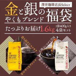 送料無料 焙煎したて レギュラー コーヒー豆 400g×4袋 珈琲豆 コーヒー 福袋 大容量 1.6kg 中挽き/豆のまま コーヒー専門店 160杯分 セット 金 銀 やくもブレンド 澤井珈琲