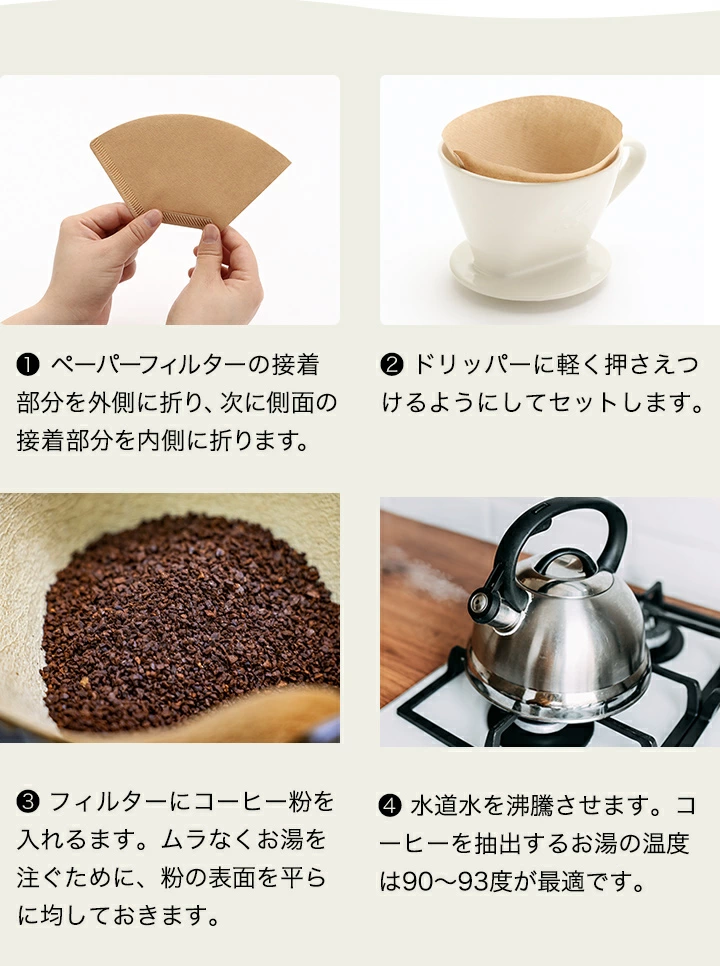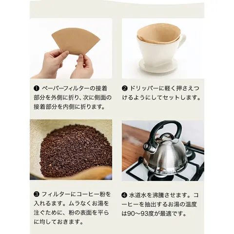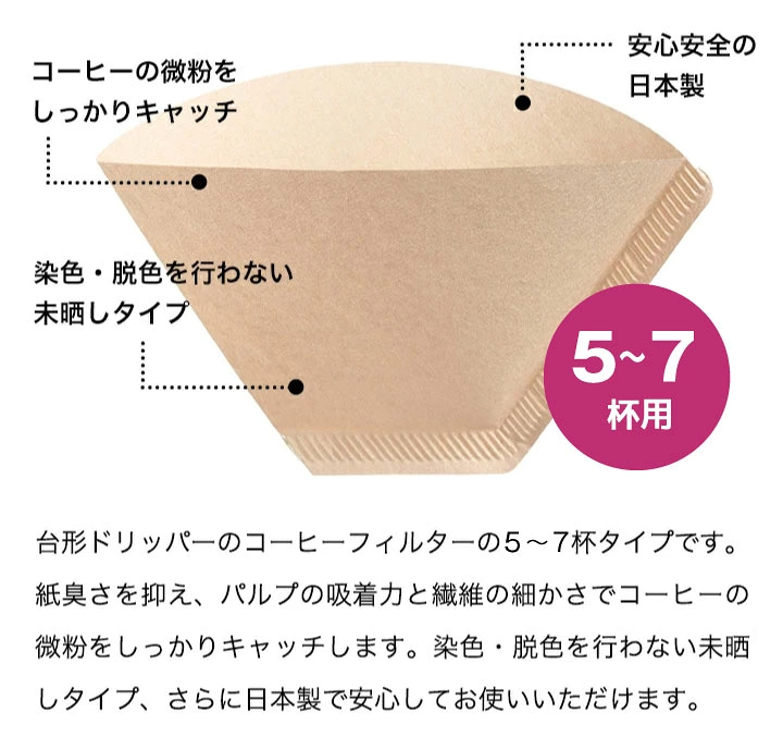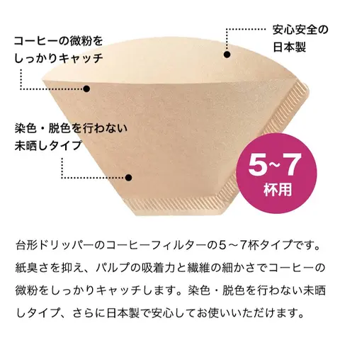 | このコーヒーフィルターは、日本製で安心・安全。微細なコーヒーの粉までしっかりキャッチし、コーヒーの味をより美味しくします。さらに、未晒しのバージンパルプを使用し、染色や脱色を行わない自然な素材で作られています。
