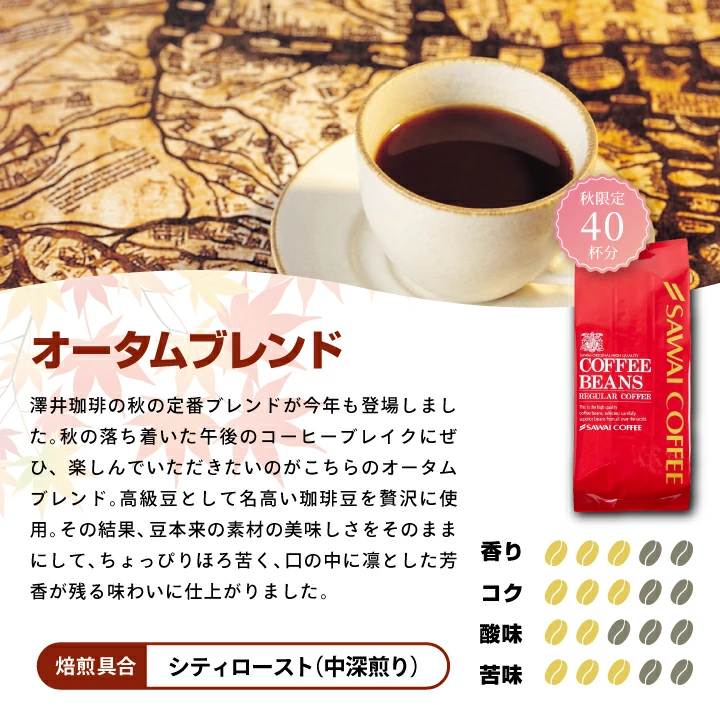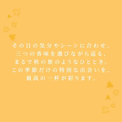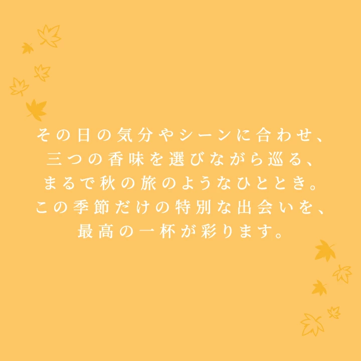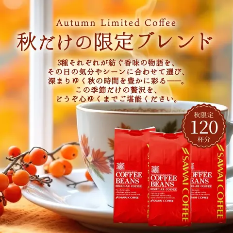 秋だけの贅沢を楽しめる、澤井珈琲の限定ブレンドセット。3種類の異なる風味が楽しめて、気分やシーンに合わせて選べるのが魅力。自宅で簡単に専門店の味わいを堪能でき、焼き立ての香りが毎日のコーヒータイムを豊かに彩ります。