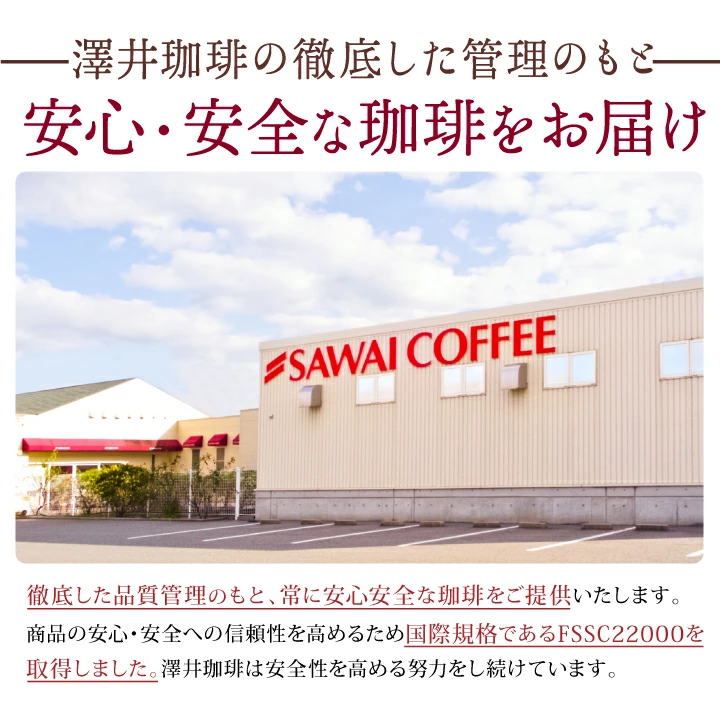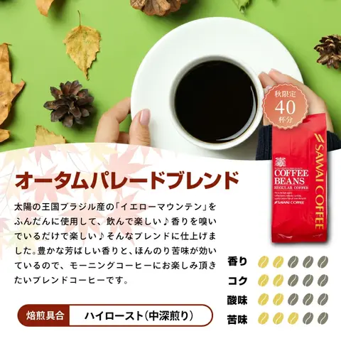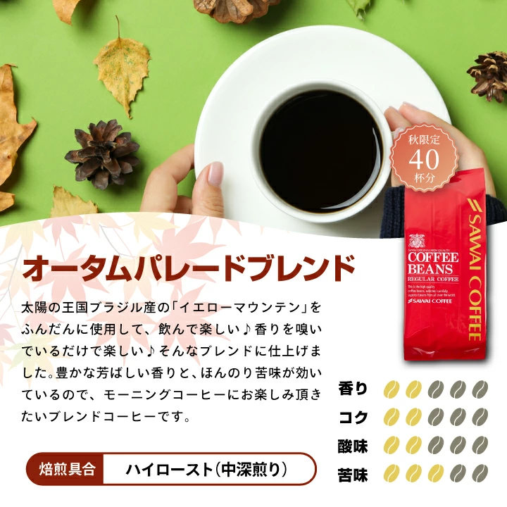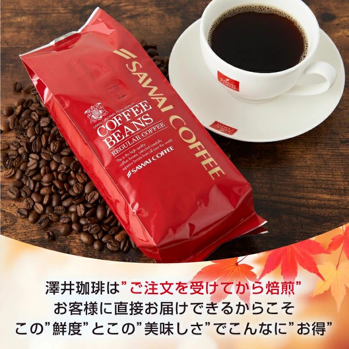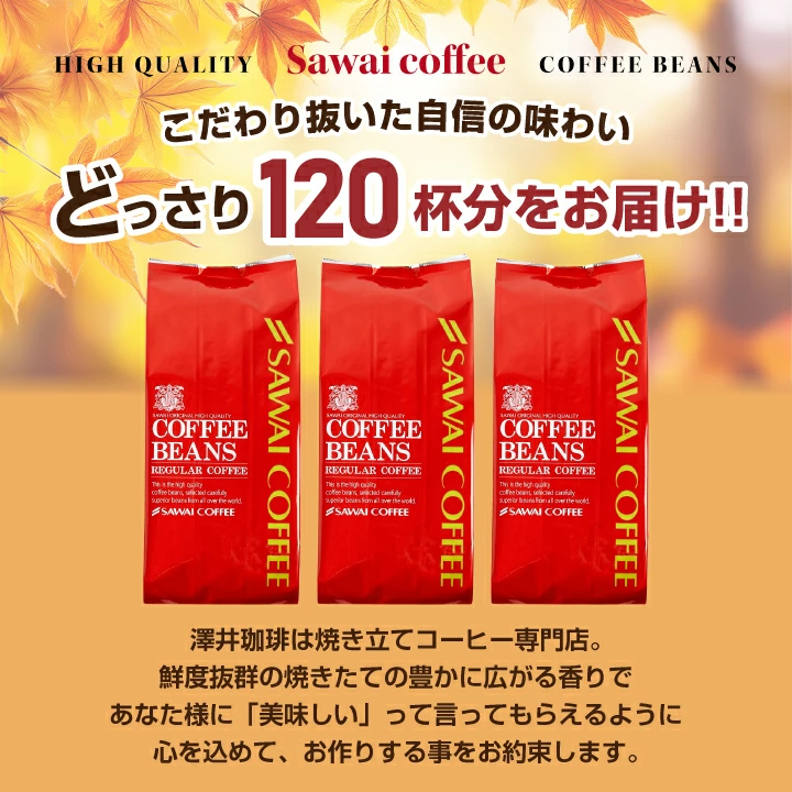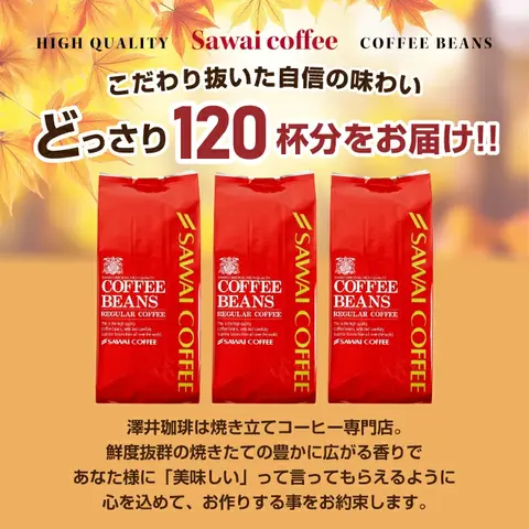 1.3種類の味が楽しめる、秋限定の贅沢セット 澤井珈琲が秋限定でお届けする特別なブレンド3種セットです。内容は「オータムブレンド」「オータムパレードブレンド」「秋のブレンド イタリアナポリ風」。それぞれ焙煎や香りの特徴が異なり、気分やシーンに合わせて飲み分けが可能です。例えば、午後のひと休みに落ち着いた味を楽しみたいときは「オータムブレンド」、朝のスタートには「オータムパレードブレンド」、しっかりとしたコクを味わいたいときは「イタリアナポリ風」と、3通りの楽しみ方ができます。 2.たっぷり120杯分、1.2kgの大容量でコスパ抜群 1セットで約120杯分のコーヒーを楽しめる大容量仕様。家族みんなで毎日飲んでもたっぷり長持ち。自宅だけでなく、職場や来客時にも便利です。購入の際、豆のままか中挽きかを選べるので、自分のスタイルに合わせて楽しめるのもポイント。中挽きを選べば、届いたその日からすぐに淹れられます。お得に、たっぷり、秋の味わいを楽しめるコーヒーセットです。 3.焙煎したての香りをお届け。安心・安全にもこだわり 澤井珈琲では「ご注文を受けてから焙煎」するため、いつでも新鮮なコーヒーが届きます。焼き立ての香ばしい香りがカップから広がり、専門店のような本格的な味わいを自宅で手軽に楽しめます。また、国際規格「FSSC22000」を取得している工場で徹底した品質管理のもと製造されているので、安心・安全。ご家族みんなで安心して飲めるのも大きな魅力です。 |