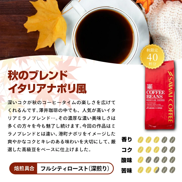 ・オータムブレンド 400g×1袋 ・オータムパレードブレンド 400g×1袋 ・秋のブレンド イタリアナポリ風 400g×1袋 |