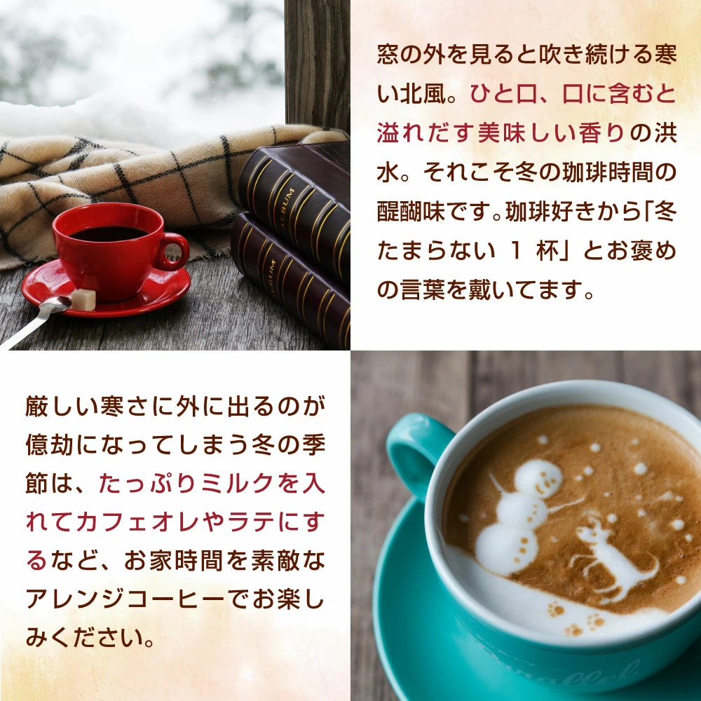 季節感のあるコーヒーを探している方:冬だけの特別なブレンドだから、季節を感じながらコーヒータイムを楽しみたい方にぴったり。冬らしい味と香りでほっとする時間が過ごせます。