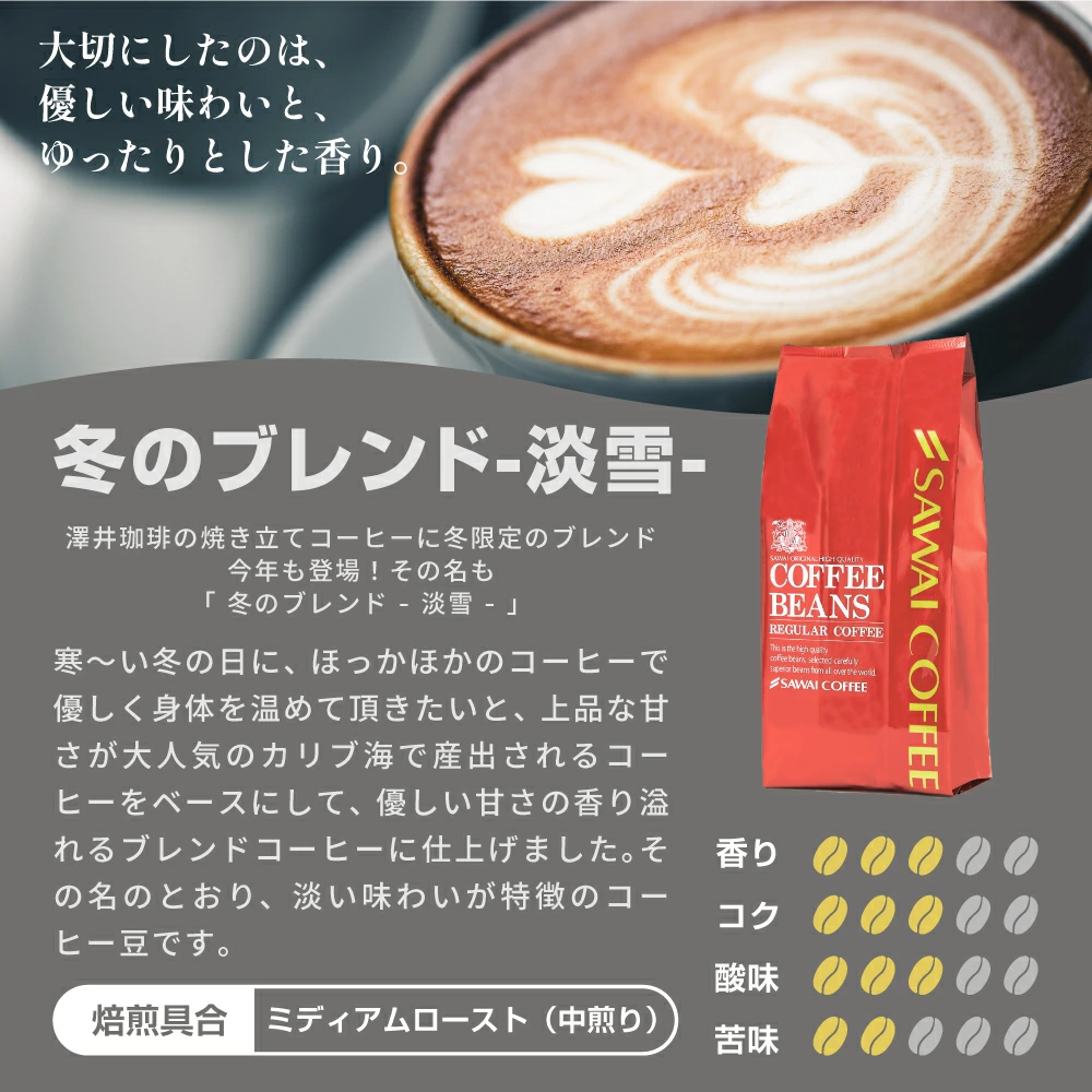 澤井珈琲が冬限定でお届けする特別なブレンド3種セットです。内容は「冬のあったかブレンド」「淡雪」「ウィンターブレンド」。それぞれ焙煎や香りの特徴が異なり、気分やシーンに合わせて飲み分けが可能です。例えば、しっかりとしたコクを味わいたいときは「冬のあったかブレンド」、優しい味わいを楽しみたいときは「淡雪」、香ばしい香りとコクを楽しみたいときには「ウィンターブレンド」と、3通りの楽しみ方ができます。