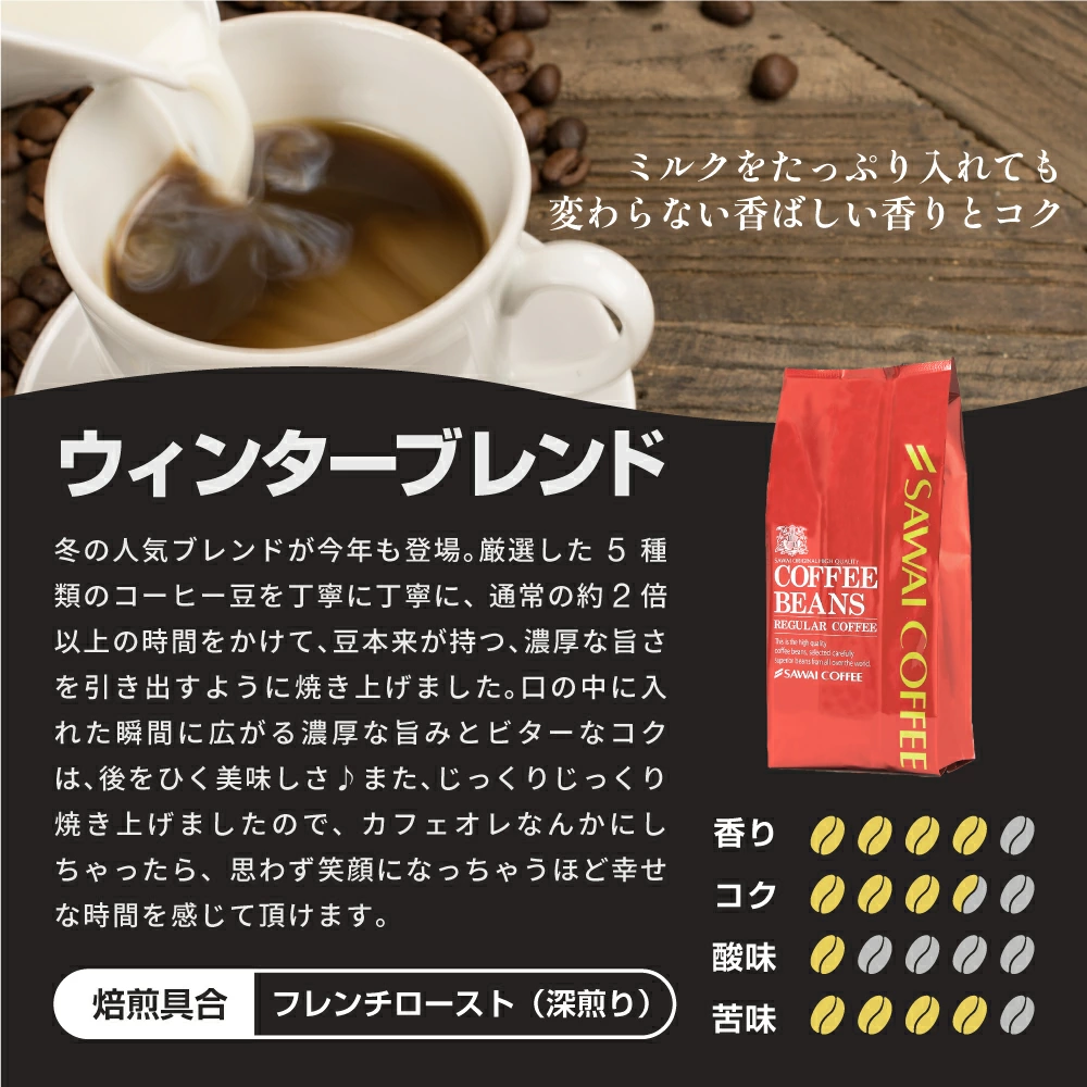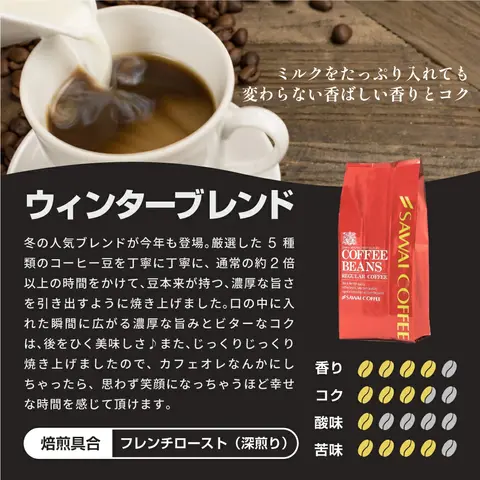 冬だけの贅沢を楽しめる、澤井珈琲の限定ブレンドセット。3種類の異なる風味が楽しめて、気分やシーンに合わせて選べるのが魅力。自宅で簡単に専門店の味わいを堪能でき、焼き立ての香りが毎日のコーヒータイムを豊かに彩ります。