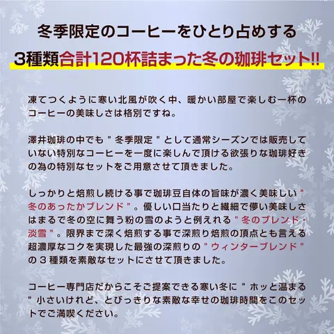 送料無料 コーヒー コーヒー豆 コーヒー粉 珈琲豆 豆のまま "冬の限定3種のコーヒー福袋!お家で飲み比べしてホッとしよう" 澤井珈琲 冬のあったかブレンド・淡雪・ウィンターブレンド 400g×3袋 飲み比べセット