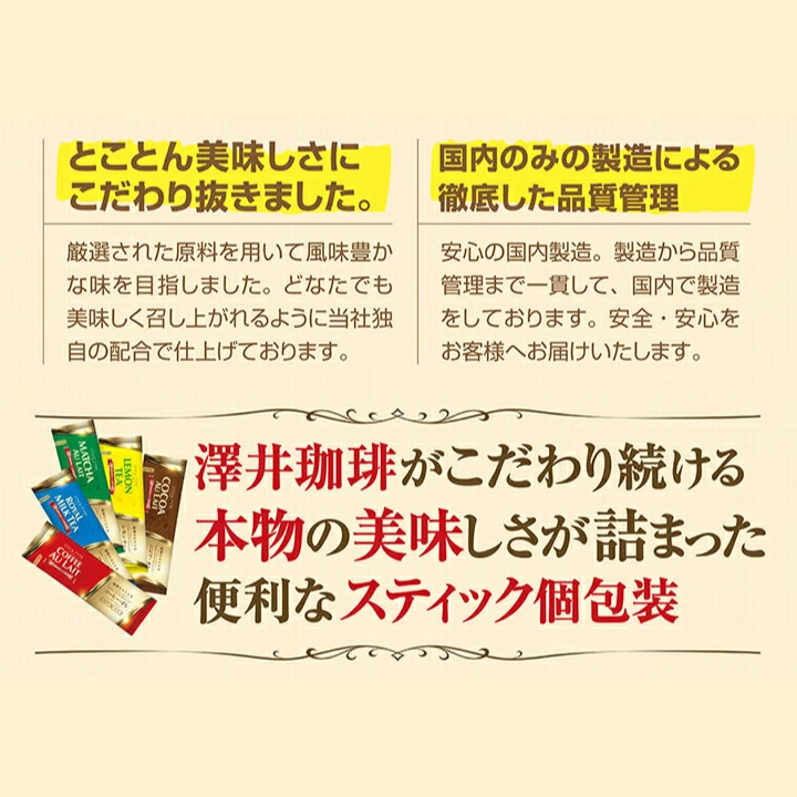この商品は、澤井珈琲が厳選した原料を使用し、手軽に本格的な味わいが楽しめるスティックタイプのインスタントドリンクセットです。コーヒーオレ、ロイヤルミルクティー、抹茶オレ、レモンティー、ココアオレの5種類があり、ホットでもアイスでも簡単に作れます。国内製造による安心品質で、忙しい日常でも贅沢なカフェ気分を味わえます。