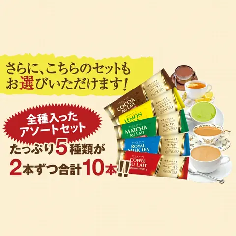 ●コーヒーオレ 13g×2袋 ●ロイヤルミルクティー 14g×2袋 ●抹茶・オレ 15g×2袋 ●レモンティー 9g×2袋 ●ココア・オレ 17g×2袋 |