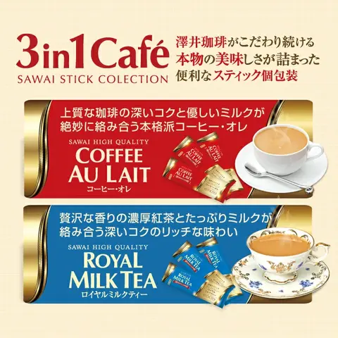1. 5つの味から選べる贅沢なラインナップ コーヒーオレ、ロイヤルミルクティー、抹茶オレ、レモンティー、ココアオレの5種類をラインナップ。上質な素材と絶妙なブレンドで、それぞれ異なる深いコクや香り、やさしい甘みを堪能できます。気分やシーンに合わせて選べ、毎日のティータイムを彩ります。多彩な味わいがあるため、家族や友人とシェアして楽しむのにも最適です。 2. 手軽に本格カフェの味を再現 スティック1本をカップやグラスに入れ、お湯や水を注ぐだけで完成する手軽さが魅力。ホットでもアイスでも楽しめ、季節や気分に合わせたアレンジが可能です。おうち時間やオフィスでも、本格的なカフェの味わいを短時間で味わえるので、急な来客時のおもてなしや、ちょっとした休憩時間にも役立ちます。 3. 国内製造の安心品質とこだわりの原料 厳選した原料を使用し、国内製造による徹底した品質管理で丁寧に作られています。風味豊かで安心して飲めるのはもちろん、澤井珈琲独自の配合が生み出す奥深い味わいが特徴。日常にちょっとした贅沢を加えたい方や、特別な時間を演出したい方にも最適です。毎日のリラックスタイムや贈り物にも喜ばれる高品質な逸品です。 |