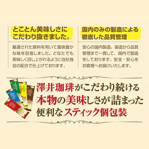 1. 手軽にカフェ気分を楽しみたい方へ: こお湯や水を注ぐだけで、ホットでもアイスでも楽しめるスティックタイプ。短時間で本格的な味わいが完成するため、忙しい朝や仕事の合間にもぴったりです。 2. いろいろな味を気軽に試してみたい方へ: 5種類の味が少量ずつ入ったお試しサイズセット。気分や好みに合わせて飲み比べができるので、自分に合うお気に入りの味を見つけたい方にぴったりです。初めての方にもおすすめです。 3. プチギフトやちょっとしたお礼を探している方へ: コンパクトな少量セットは、手土産やお礼、プチギフトにも最適。国内製造の安心品質と、澤井珈琲こだわりの味わいで、気軽に贈れる上質なプレゼントとして喜ばれます。 |