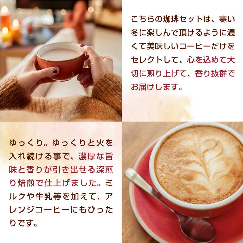 | 寒い冬にぴったりな、澤井珈琲の「冬限定グルメコーヒー4種セット」。店長が厳選した4つの深煎りコーヒーと手作りおからクッキーが入った特別セットです。1種類40杯分、合計160杯の大容量で、香ばしさとコクをじっくり楽しめます。 1. 冬だけの特別ブレンドで、心まであたたまる 店長が冬のために選んだ4種類のブレンドは、寒い季節にホッと温まる味わいを追求。深煎り中心で、コクと香りがしっかりと立ち、ミルクや砂糖を加えても風味が負けません。 「グルメブレンド」は甘味とコクのバランスが良く、「カブキ」は昭和喫茶を思わせる懐かしい味わい。「ダークナイトブレンド」は濃厚でカフェオレにぴったり、「豆太のブレンド」は優しい後味が魅力です。冬のカフェタイムが待ち遠しくなる、贅沢な一杯です。 2. たっぷり160杯分のボリューム満点セット 1種類あたり約40杯分×4種類、合計160杯分とたっぷり楽しめるお得なセットです。 家族みんなで味わうのはもちろん、日替わりで違う味を楽しむことも可能。 コーヒー専門店ならではの焙煎技術で、豆の旨味を最大限に引き出しています。毎日のリラックスタイムに、本格的な香りとコクをお楽しみください。 3. コーヒー専門店の味と、やさしい手作りクッキー セットには澤井珈琲の人気スイーツ「おからクッキー」付き。専属パティシエがひとつひとつ丁寧に焼き上げ、素材の風味を大切にしています。 コーヒーや紅茶にぴったりで、サクサクの食感とほんのり甘い味わいが人気。おうちで過ごす冬のひとときを、香ばしいコーヒーと手作りクッキーでほっと温まる時間に変えてくれます。 |
