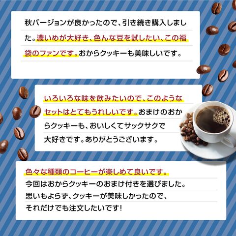 | 内容量 | ●レギュラーコーヒー ・グルメ大賞受賞ブレンド 400g ・カブキ 400g ・ダークナイトブレンド 400g ・豆太のブレンド 400g ●おからクッキー 7枚入り 1袋 (プレーン、珈琲、紅茶味のいずれか1種類) ※種類は選べません。 |