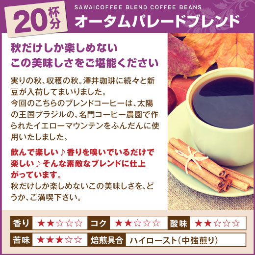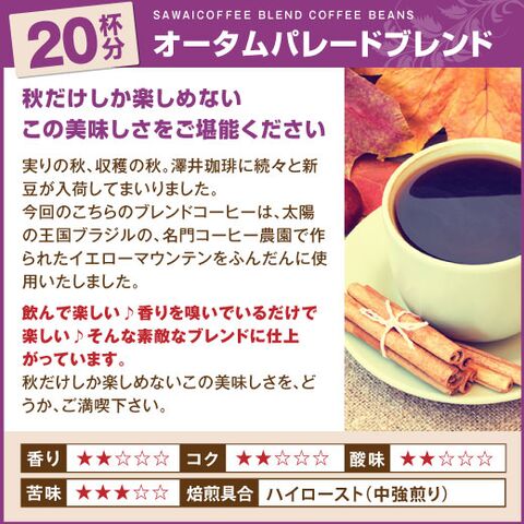 内容量 | ●オータムパレードブレンド 200g ●秋のブレンド イタリアナポリ風 200g ●カフェオレブレンド 200g ●パンプキンシフォンケーキ 1個 (直径12cm×高さ8cm) |