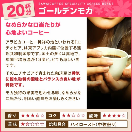 こちらの商品は、澤井珈琲が厳選した3種類の個性豊かなコーヒーがセットになっており、「スプリングブレンド」は、エルサルバドル産の“カップ・オブ・エクセレンス”豆を使い、ほどよい苦味と凛とした芳香が特徴で、春の午後にぴったりの一杯。「エクセレントブレンド」はブラジルの最高級豆を使い、しっかりとした苦味とコクで、大人のコーヒータイムにおすすめ。「ゴールデンモカ」はエチオピア産で、モカ特有の果実のような酸味と香り、なめらかな口当たりが魅力。どれも20杯分入りで飲み比べも楽しめます。