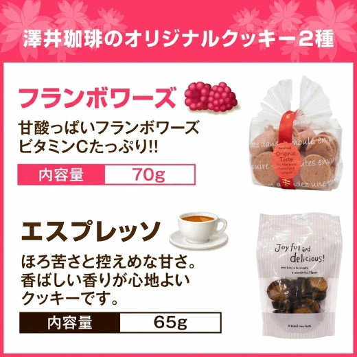 澤井珈琲のパティシエが一つ一つ手作りで丁寧に仕上げたオリジナルクッキーは、特にコーヒーとの相性が抜群で、コーヒータイムをより豊かにすること間違いなしです。コーヒー専門店ならではのコーヒーとの相性が計算し尽くされた一品です。