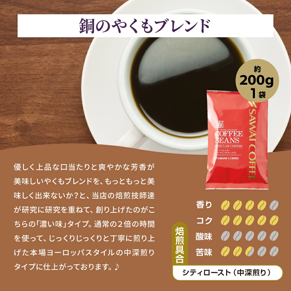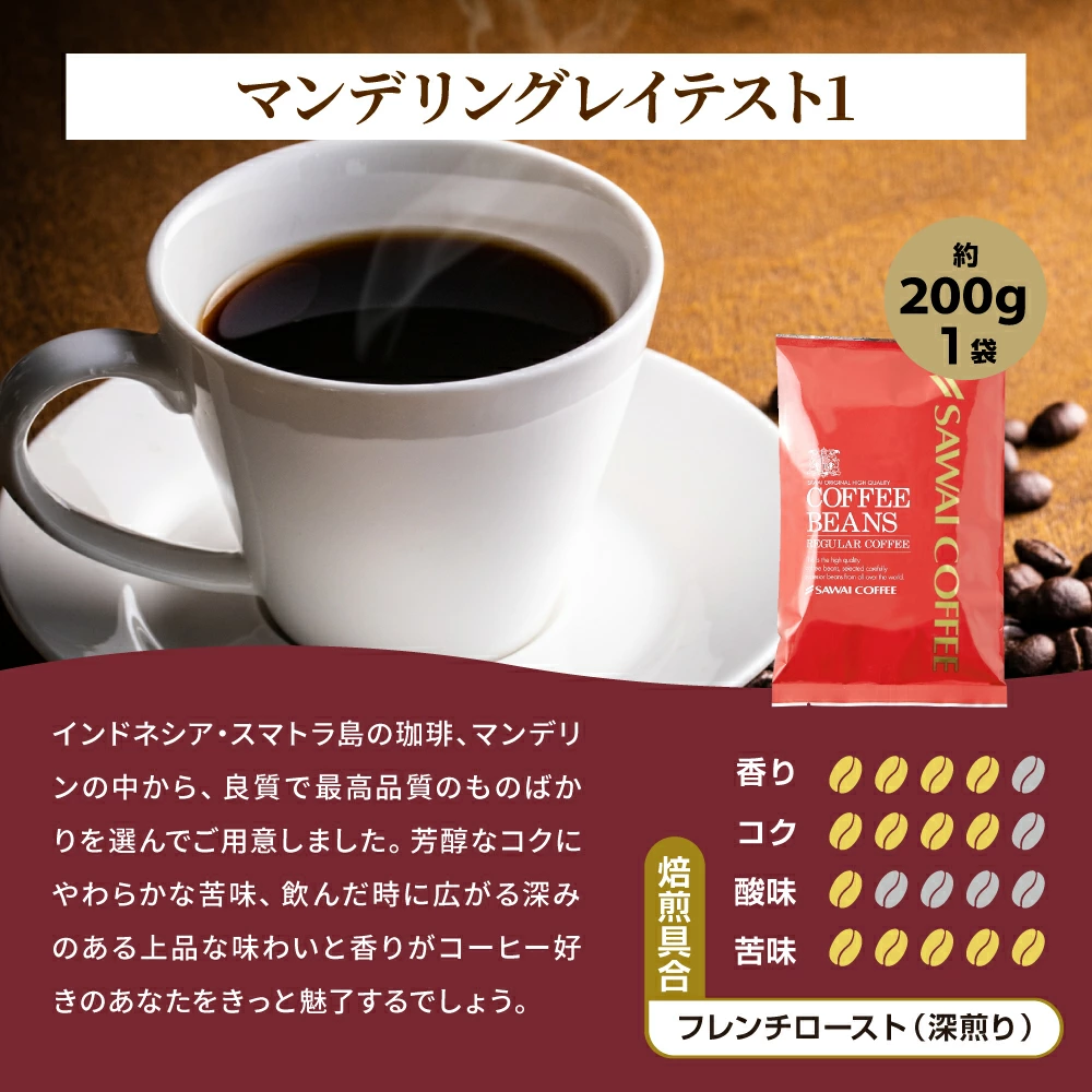 ・マンデリングレイテスト1 200g×1袋 ・豆太のブレンド 200g×1袋 ・銅のやくもブレンド 200g×1袋 ・ハイブレンド 200g×1袋 ・ダークナイトブレンド 200g×1袋 |