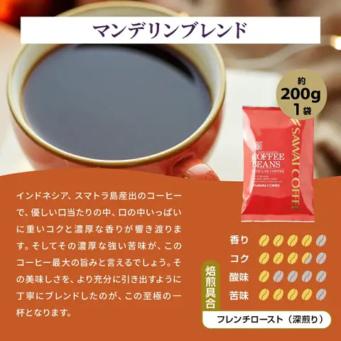 ・マンデリンブレンド 200g×1袋 ・ハイブレンド 200g×1袋 ・カブキ 200g×1袋 ・鳥取砂丘ブレンド 200g×1袋 ・コンチネンタルブレンド 200g×1袋 |