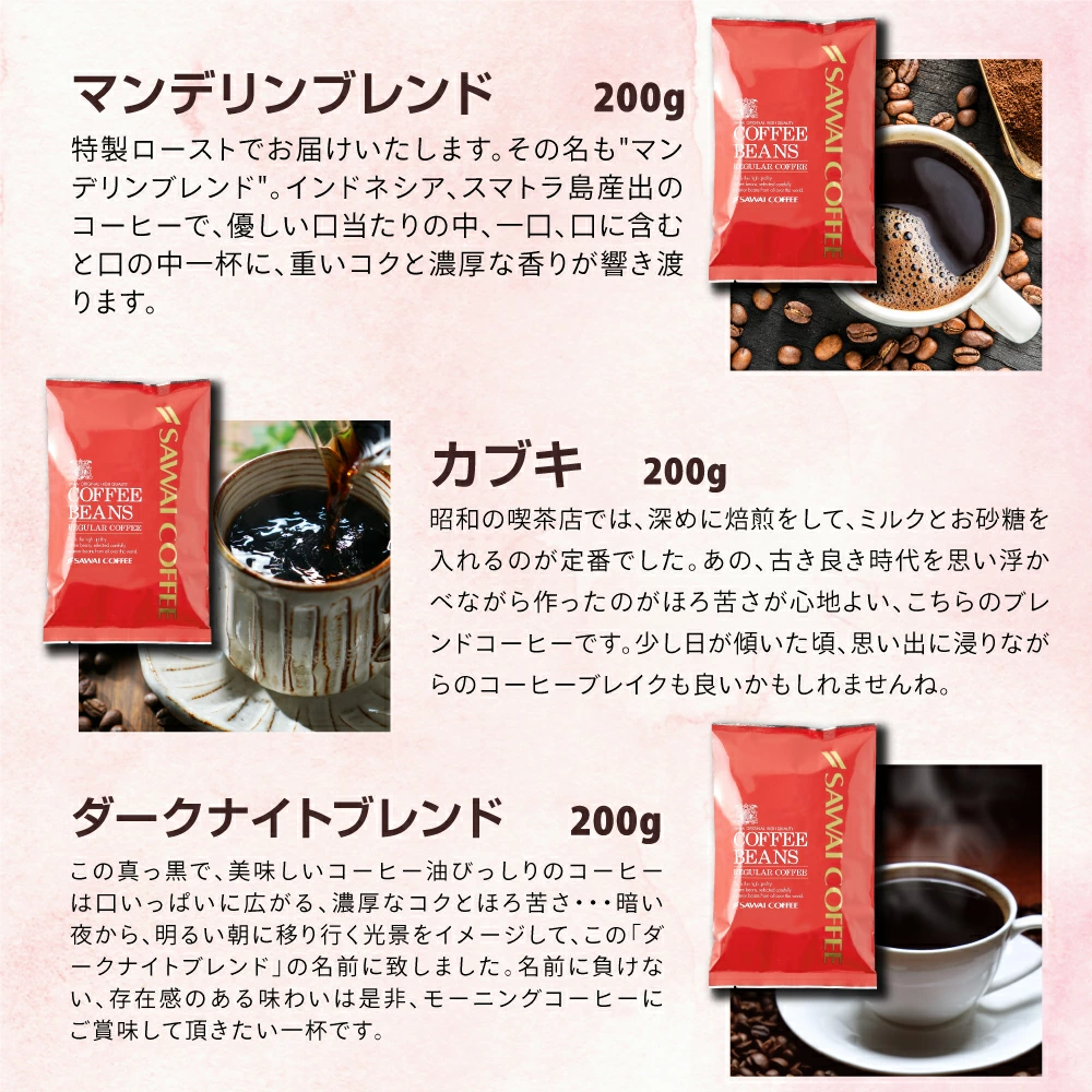 ・マンデリングレイテスト1 200g×1袋 ・豆太のブレンド 200g×1袋 ・銅のやくもブレンド 200g×1袋 ・ハイブレンド 200g×1袋 ・ダークナイトブレンド 200g×1袋 ・マンデリンブレンド 200g×1袋 ・鳥取砂丘ブレンド 200g×1袋 ・カブキ 200g×1袋 ・ベートーベンブレンド 200g×1袋 ・ミラノブレンド 200g×1袋 |
