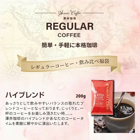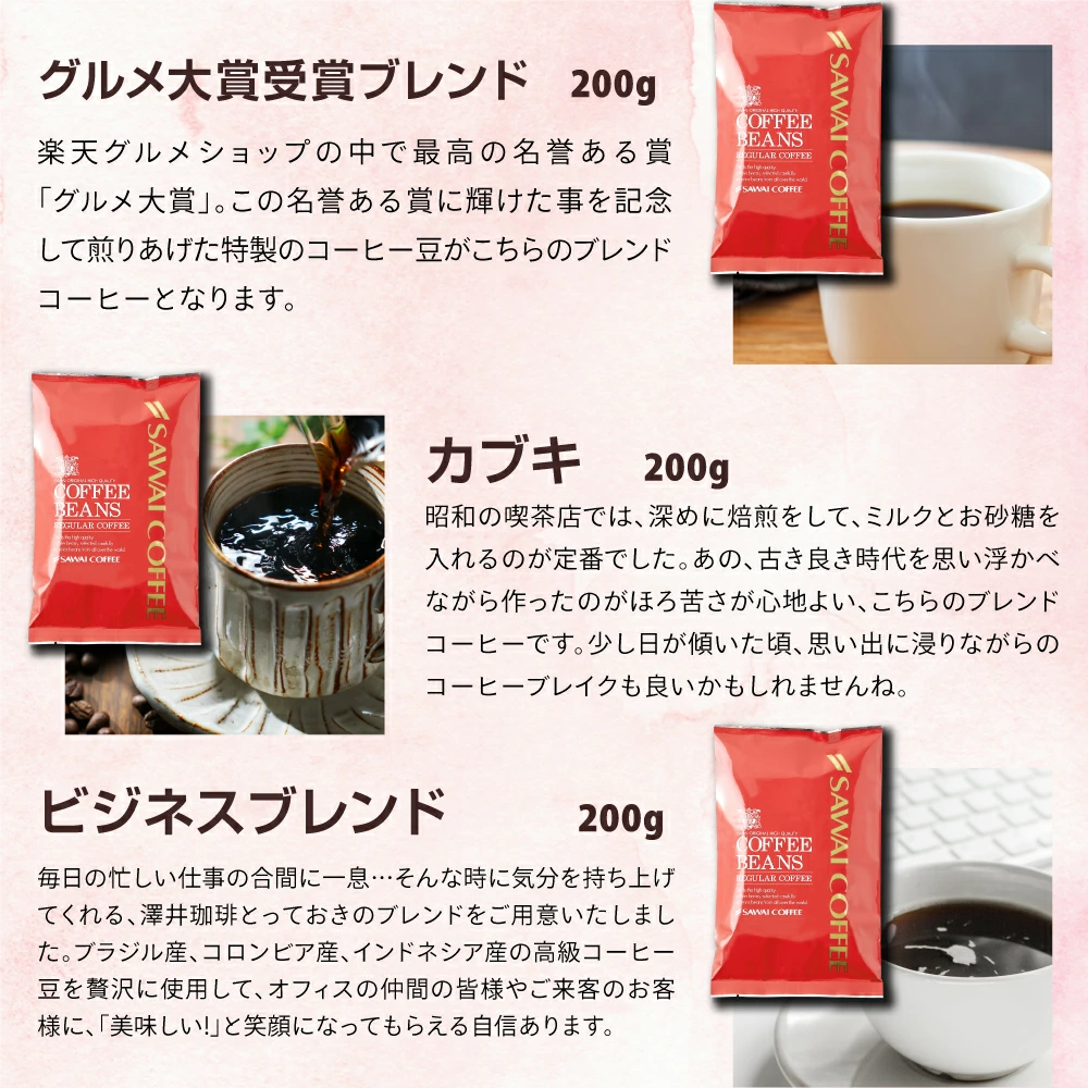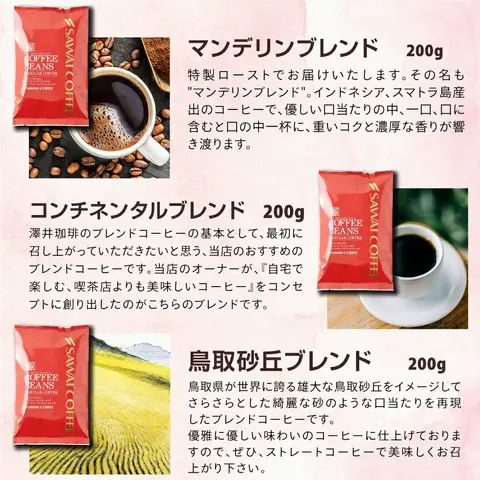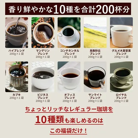 ・ハイブレンド 200g×1袋 ・マンデリンブレンド 200g×1袋 ・コンチネンタルブレンド 200g×1袋 ・鳥取砂丘ブレンド 200g×1袋 ・グルメ大賞受賞ブレンド 200g×1袋 ・カブキ 200g×1袋 ・ビジネスブレンド 200g×1袋 ・オフィスブレンド 200g×1袋 ・サンライトブレンド 200g×1袋 ・ロイヤルブレンド 200g×1袋 |