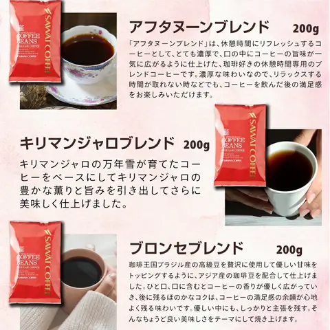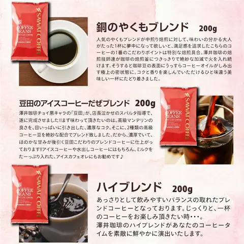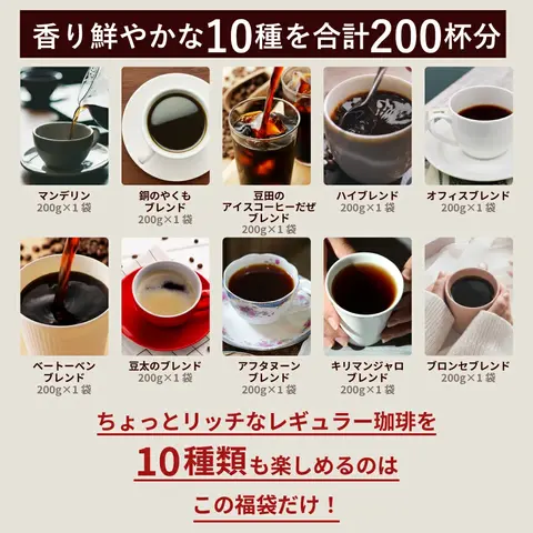 ・マンデリン 200g×1袋 ・銅のやくもブレンド 200g×1袋 ・豆田のアイスコーヒーだぜブレンド 200g×1袋 ・ハイブレンド 200g×1袋 ・ベートーベンブレンド 200g×1袋 ・オフィスブレンド 200g×1袋 ・豆太のブレンド 200g×1袋 ・アフタヌーンブレンド 200g×1袋 ・キリマンジャロブレンド 200g×1袋 ・ブロンセブレンド 200g×1袋 |