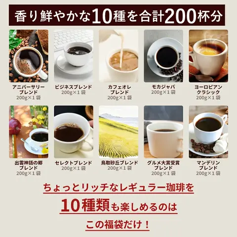送料無料 4月のおすすめレギュラーコーヒー10種200杯分福袋 200g×10袋