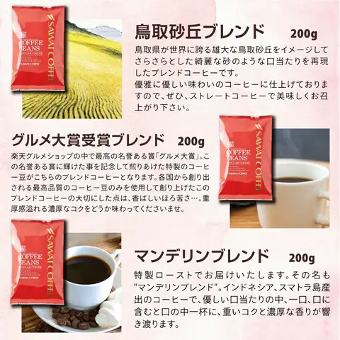 澤井珈琲(さわいこーひー)では、お客様のお家に商品が届き、箱を開けた瞬間。そして、トレードマークの赤いコーヒー袋の封を開けた時に鮮度抜群の「香り高さ」と、飲んだときの「味わい」に感動して頂けるように、レギュラーコーヒーはご注文を頂いてから焙煎をして焼きたてのコーヒー、コーヒー豆、珈琲、珈琲豆をお届けをしている焼き立て珈琲専門店です。お客様に「美味しい」と言って喜んで頂く事が私たちの喜びと思ってます。「美味しいコーヒーをお届けしたい」と想い続けて生まれたこだわりの味を、どうぞ、この機会にお楽しみくださいませ。澤井珈琲では、コーヒー豆は挽き方がご選択いただけます。珈琲豆を挽く事をお楽しみ頂ける『豆のまま』や、私共の専用の特注サイズの大型のミルで挽いて、コーヒー粉の状態にしてお届けする方法がございます。中挽き、細挽き、粗挽き、荒挽きなど様々な挽き方がございますが、私共がお薦めする『店長のおすすめ挽き』にて、そのコーヒーに合った一番美味しいと思える挽き方に挽いてお届けします。東京の銀座にも実店舗を構え、都内では浅草やスカイツリーのあるソラマチにも出店。「鳥取のコーヒー屋さん」とも呼ばれてますが、空気が綺麗で自然豊かな鳥取県に焙煎工場を構え、隣接する島根県の松江市や出雲市にも実店舗がございます。顔の見えないネット通販ですが、全国11店舗を展開する安心安全な澤井珈琲は、特徴的な「赤いコーヒー袋」に入れて、全国の珈琲好きにお選び頂いてます。よく間違えられる名前として、沢井珈琲、沢井コーヒー、澤井珈琲店、澤井珈琲本店、さわいこーひー、サワイコーヒーなどがございますが、正式名称は澤井珈琲となります。