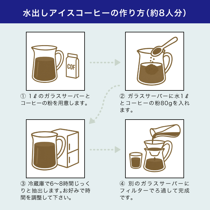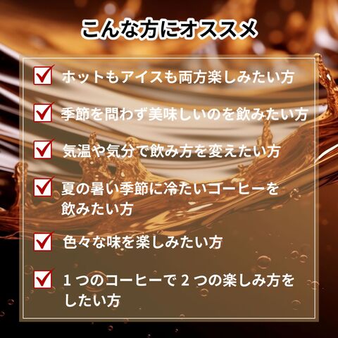 こんな方にオススメです | こんな方にオススメです 1. 自宅で美味しいアイスコーヒーを楽しみたい方 2. 水出しコーヒーを試したい方 3. 夏の暑い季節に冷たいコーヒーを飲みたい方 4. 色々な味を楽しみたい方 |