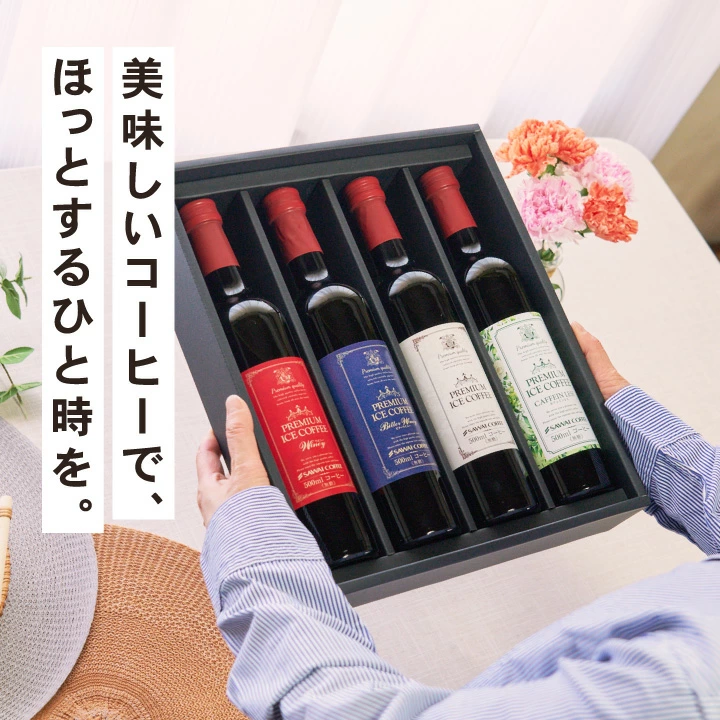 | 内容量 | 下記よりセット内容をご選択いただけます。 ●赤+青+白+カフェインレスセット ・プレミアムアイスコーヒー ワイニー 無糖 500ml×1本(赤ラベル) ・プレミアムアイスコーヒー ビターワイニー 無糖 500ml×1本(青ラベル) ・プレミアムアイスコーヒー 無糖 500ml×1本(白ラベル) ・プレミアムアイスコーヒー カフェインレス 無糖 500ml×1本 ●赤+青+白+カフェオレベースセット ・プレミアムアイスコーヒー ワイニー 無糖 500ml×1本(赤ラベル) ・プレミアムアイスコーヒー ビターワイニー 無糖 500ml×1本(青ラベル) ・プレミアムアイスコーヒー 無糖 500ml×1本(白ラベル) ・プレミアムカフェオレベース 無糖 500ml×1本(希釈タイプ) |