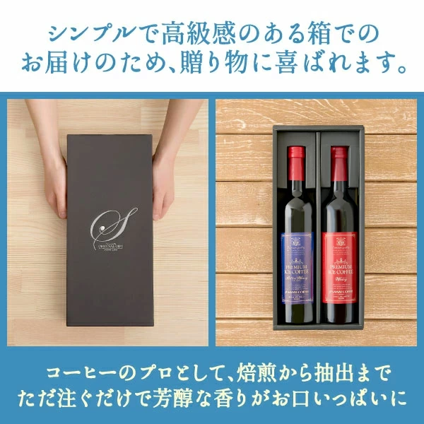 澤井珈琲のプレミアムアイスコーヒー2本セットは、こだわり抜かれたコーヒー豆を使用し、すっきりとした味わいと奥深いコクを楽しめる贅沢なギフトセットです。ワインボトルのような高級感のあるデザインで、特別な方への贈り物や自分へのご褒美にぴったり。無糖タイプなので、お好みの甘さに調整でき、シンプルにコーヒーの美味しさを味わえます。 1. コーヒー専門店ならではの本格的な味わい 澤井珈琲のプレミアムアイスコーヒーは、コーヒー専門店が厳選した豆を使用し、最高の香りと風味を引き出しています。ビターワイニーは、深い苦みの中にコーヒー本来の甘さが感じられる仕上がり。ワイニーは、フルーティーな香りとすっきりとした後味が特長で、飲みやすさを重視しています。どちらも無糖タイプなので、甘さを控えたい方や自分好みにアレンジしたい方におすすめです。 2. 高級感あふれるワインボトルデザイン プレミアムアイスコーヒーは、香りの保管性が高いワインボトルに詰められています。見た目の美しさはもちろん、開封した瞬間に広がる香りも格別です。特別なギフトとして選ばれる理由は、そのデザインにもあります。大切な方への誕生日プレゼントや、お世話になった方への感謝の気持ちを伝えるギフトとしても最適です。化粧箱入りで、開ける瞬間の特別感も演出できます。 3. 安心・安全な品質で、毎日飲みたくなる 澤井珈琲のプレミアムアイスコーヒーは、保存料・着色料・香料を一切使用していません。さらに、中国産原料不使用、国内加工で品質管理もしっかりされています。体に優しいコーヒーを求める方にぴったりの安心設計。毎日のリラックスタイムや食後の一杯として、安心して楽しめます。 |