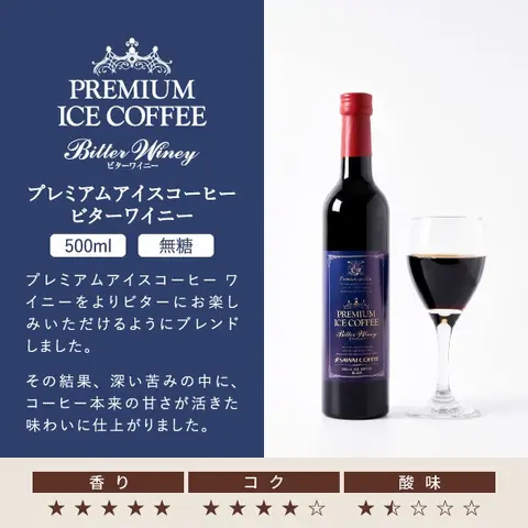 | 内容量 | プレミアムアイスコーヒー ビターワイニー 500ml×1本(青ラベル) プレミアムアイスコーヒー ワイニー 500ml×1本(赤ラベル) |
