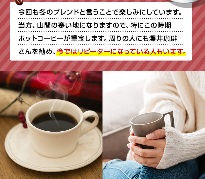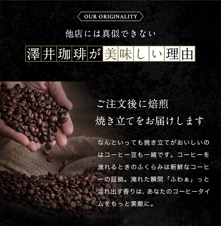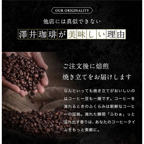 澤井珈琲(さわいこーひー)では、お客様のお家に商品が届き、箱を開けた瞬間。そして、トレードマークの赤いコーヒー袋の封を開けた時に鮮度抜群の「香り高さ」と、飲んだときの「味わい」に感動して頂けるように、レギュラーコーヒーはご注文を頂いてから焙煎をして焼きたてのコーヒー、コーヒー豆、珈琲、珈琲豆をお届けをしている焼き立て珈琲専門店です。お客様に「美味しい」と言って喜んで頂く事が私たちの喜びと思ってます。「美味しいコーヒーをお届けしたい」と想い続けて生まれたこだわりの味を、どうぞ、この機会にお楽しみくださいませ。澤井珈琲では、コーヒー豆は挽き方がご選択いただけます。珈琲豆を挽く事をお楽しみ頂ける『豆のまま』や、私共の専用の特注サイズの大型のミルで挽いて、コーヒー粉の状態にしてお届けする方法がございます。中挽き、細挽き、粗挽き、荒挽きなど様々な挽き方がございますが、私共がお薦めする『店長のおすすめ挽き』にて、そのコーヒーに合った一番美味しいと思える挽き方に挽いてお届けします。東京の銀座にも実店舗を構え、都内では浅草やスカイツリーのあるソラマチにも出店。「鳥取のコーヒー屋さん」とも呼ばれてますが、空気が綺麗で自然豊かな鳥取県に焙煎工場を構え、隣接する島根県の松江市や出雲市にも実店舗がございます。顔の見えないネット通販ですが、全国11店舗を展開する安心安全な澤井珈琲は、特徴的な「赤いコーヒー袋」に入れて、全国の珈琲好きにお選び頂いてます。よく間違えられる名前として、沢井珈琲、沢井コーヒー、澤井珈琲店、澤井珈琲本店、さわいこーひー、サワイコーヒーなどがございますが、正式名称は澤井珈琲となります。