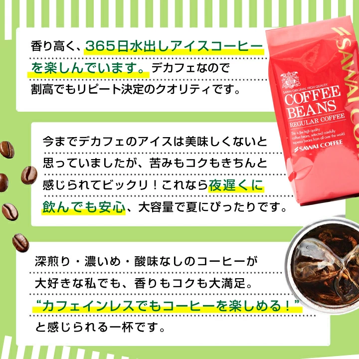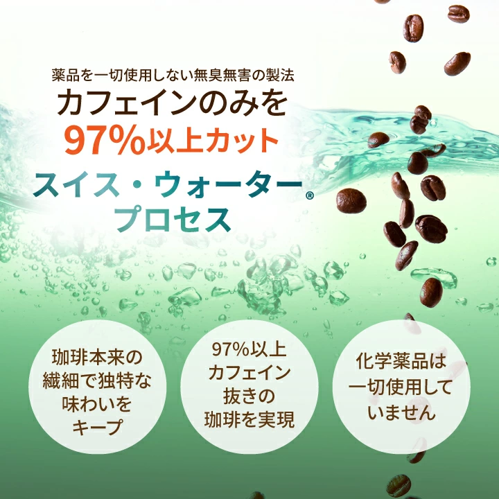 | こんな方にオススメです | 妊娠中や授乳中の方: 「スイス・ウォータープロセス」という方法で化学薬品を使用せずにカフェインを97%以上カットしているため、安心して美味しいコーヒーを楽しめます。 プレゼント、贈り物として:カフェインカットで、妊婦さんやご高齢の方も安心して召し上がれますので贈答品やギフトにもぴったりです。 健康に気を遣っている方: カフェインの過剰摂取を避けたい方や、胃が荒れやすい方にもおすすめです。 |