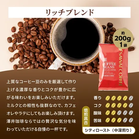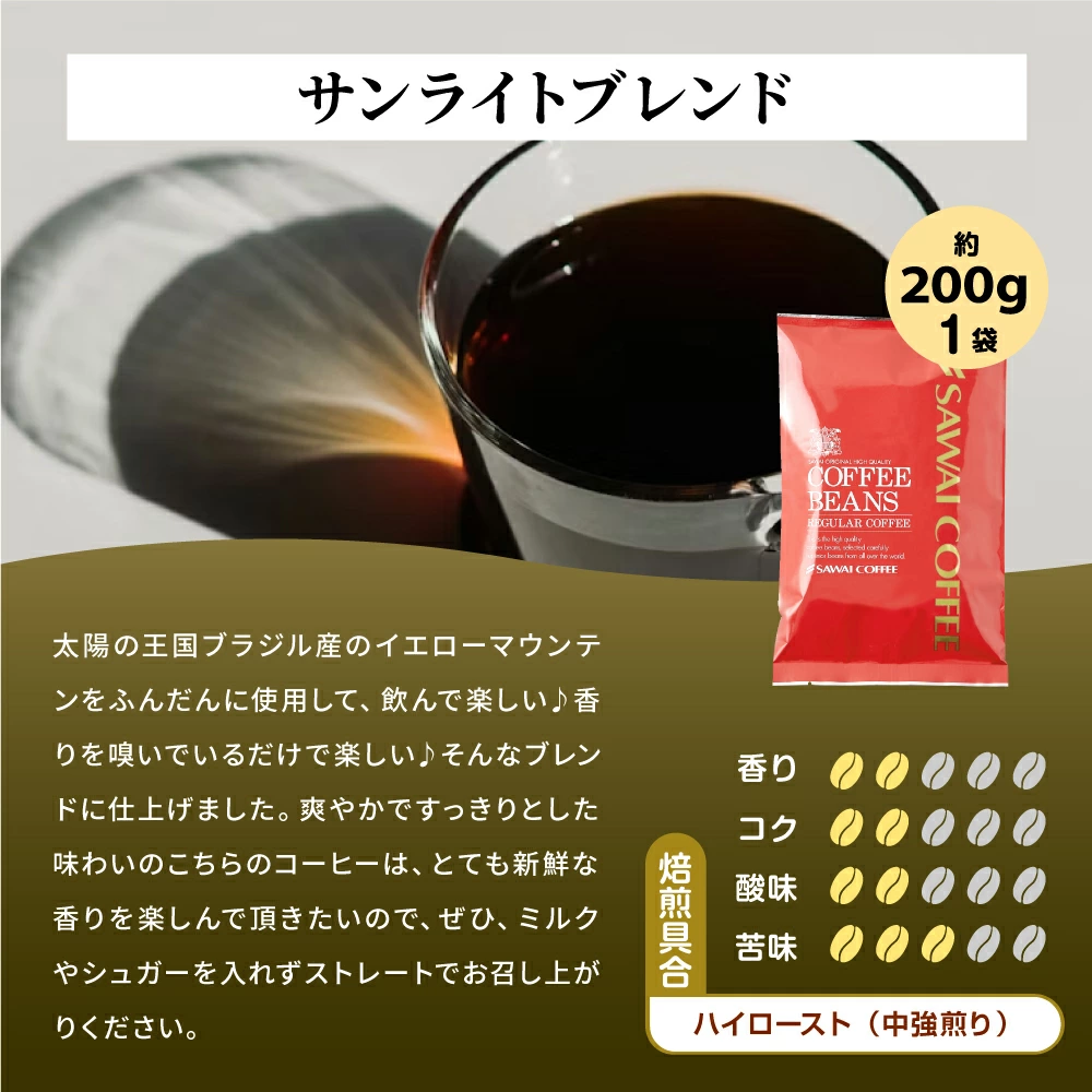 ・アニバーサリーブレンド 200g×1袋 ・リッチブレンド 200g×1袋 ・サンライトブレンド 200g×1袋 |