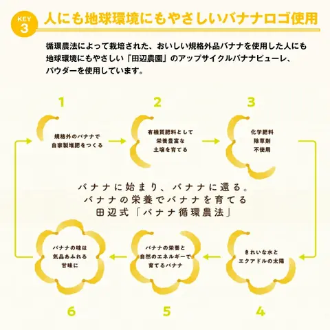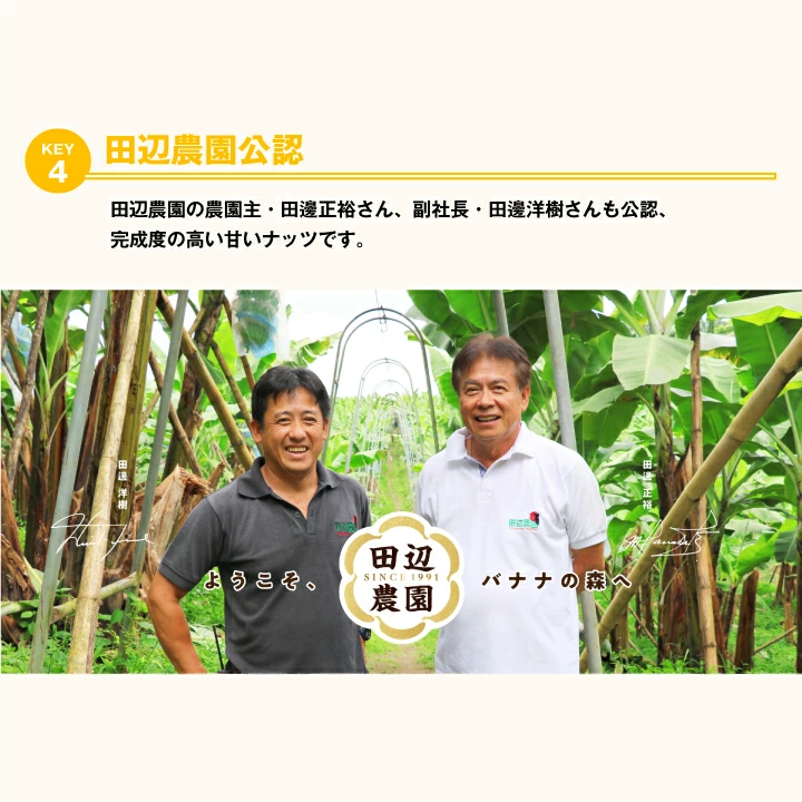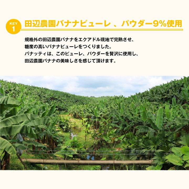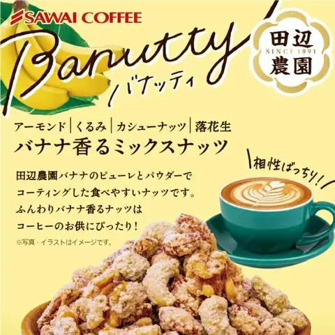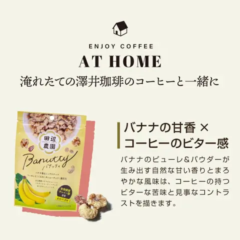 | 「Banutty(バナッティ)」は、エクアドルの田辺農園で育った高糖度バナナのピューレとパウダーを使用した、香料不使用のミックスナッツです。規格外バナナをアップサイクルして活用し、人にも地球にもやさしい商品としてつくられています。職人が手作業で丁寧にコーティングしたナッツは、バナナの自然な甘みと香ばしさが調和し、コーヒーのビター感と見事にマッチ。香り豊かでまろやかな味わいが楽しめる、新しいコーヒータイムのお供です。 1. 田辺農園バナナの自然な甘みと香り エクアドルの田辺農園で育った完熟バナナをピューレとパウダーにし、贅沢に9%使用。香料を一切使わず、バナナ本来の豊かな風味をぎゅっと閉じ込めました。自然由来のやさしい甘みと芳醇な香りがナッツにふんわりと重なり、ひと口ごとに広がる上品な味わいが特長です。お子様から大人まで安心して楽しめる、素材の良さを感じるナッツスイーツです。 2. 人にも地球にもやさしいアップサイクル製法 「Banutty」に使われているバナナは、規格外で市場に出回らないものをアップサイクルして活用。田辺農園独自の“バナナ循環農法”で育てられた、環境にも人にもやさしいバナナです。堆肥づくりから始まり、化学肥料・除草剤不使用で育てられた自然の恵みが詰まった一粒。美味しさだけでなく、持続可能な農業への想いが込められた、エシカルなスナックです。 3. コーヒーとの極上マリアージュ 香ばしいナッツとまろやかなバナナの甘みが、コーヒーのビターな風味や酸味・果実感と絶妙に調和。淹れたての澤井珈琲と一緒に味わえば、まるでデザートのような贅沢な時間を演出します。ナッツのロースト香とコーヒーの焙煎香が重なり、豊かな香りが口いっぱいに広がる極上のペアリングを楽しめます。日常のコーヒータイムを少し特別にしてくれる一品です。 |