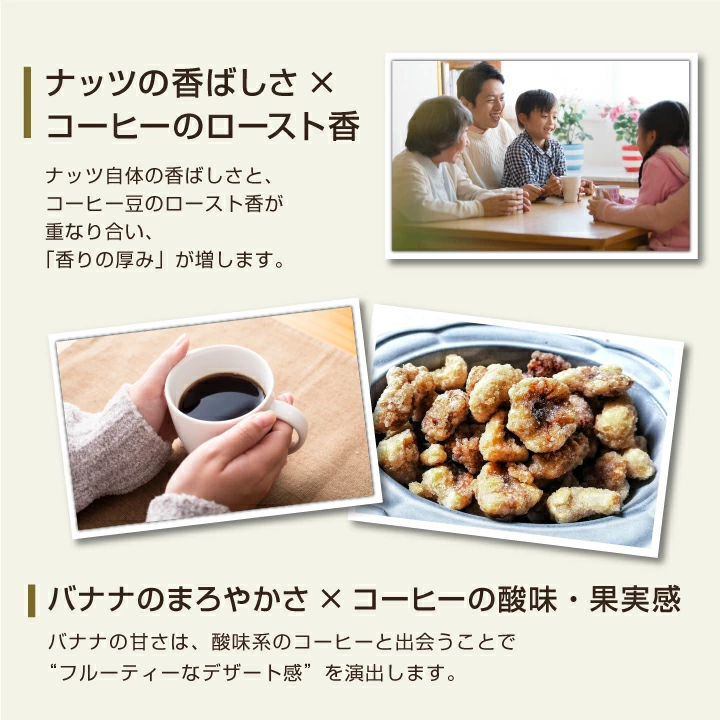 | こんな方にオススメです | コーヒー好きの方にぴったり:香ばしいナッツとバナナのやさしい甘みが、コーヒーの苦味・酸味と絶妙に調和。まるでデザートを味わうような贅沢なひとときを楽しめます。 素材や環境にこだわる方へ:香料不使用で、規格外バナナをアップサイクルした地球にも人にもやさしい製法。ナチュラル志向やサステナブルライフを大切にする方におすすめです。 手軽に楽しむギフトやおやつに:個包装タイプで持ち歩きやすく、仕事の合間やお出かけ時にもぴったり。自然の甘さと香ばしさが広がる上品な味わいは、贈り物にも喜ばれます。 |