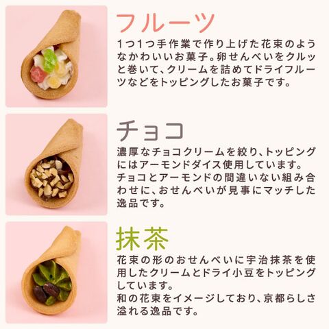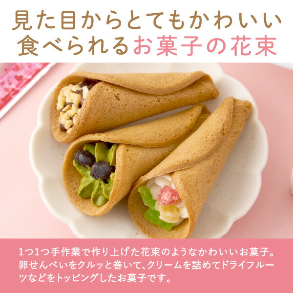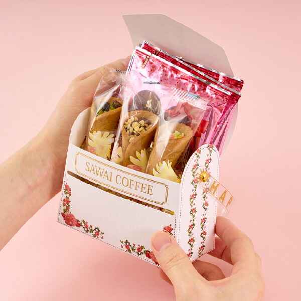 1.見た目も味も楽しめる「お菓子の花束」 ひとつひとつ丁寧に手作りされた「花彩つむぎ」は、卵せんべいをくるっと巻いてクリームを詰め、ドライフルーツやナッツをトッピングした華やかなお菓子です。かわいらしい見た目と上品な甘さで、食べるたびに笑顔になれる一品。フルーツ・チョコ・抹茶の3つの味を楽しめます。 2.甘いお菓子にぴったりの「バレンタインブレンドコーヒー」 澤井珈琲のブレンダーが、バレンタインに合わせて特別に作り上げた限定ブレンド。中深煎りのしっかりしたコクとほろ苦さが、甘いお菓子との相性抜群。お湯を注ぐだけで本格的な香りが広がるドリップバッグタイプで、手軽にカフェ気分を味わえます。 3.手渡しにちょうどいい上品なギフトボックス入り 花柄がかわいい専用ギフトボックスに入っており、持ち手付きでプレゼントしやすいデザイン。会社の方やママ友などへの「ちょっとしたありがとう」を伝えるのにぴったりのプチギフトです。気軽に渡せて、心がほっと温まる優しい贈り物になります。 |