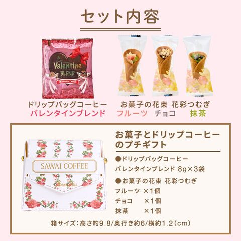| 内容量 | ●ドリップバッグ バレンタインブレンド 8g×3袋 ●お菓子の花束 花彩つむぎ ・フルーツ ×1個 ・チョコ ×1個 ・抹茶 ×1個 ●バレンタインカード ●ギフト袋 ×1枚 上記を【5セット】お届けいたします。 |