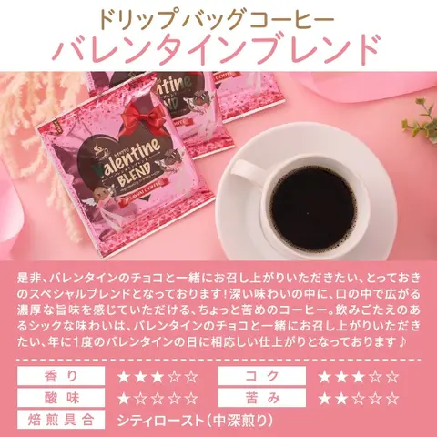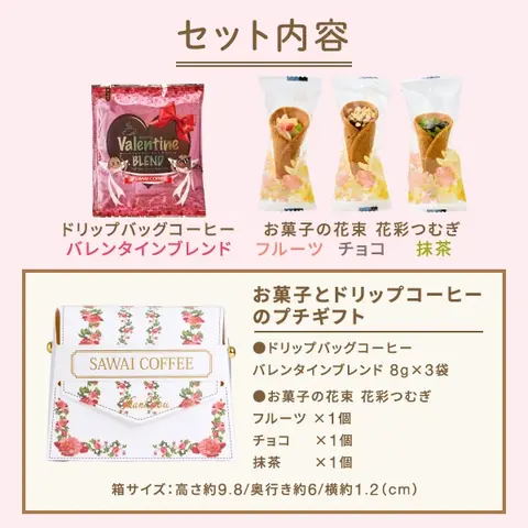 | 内容量 | ●ドリップバッグコーヒー バレンタインブレンド 8g×3袋 ●お菓子の花束 花彩つむぎ ・フルーツ ×1個 ・チョコ ×1個 ・抹茶 ×1個 +ご購入個数分のギフト袋を無料でお付けします |