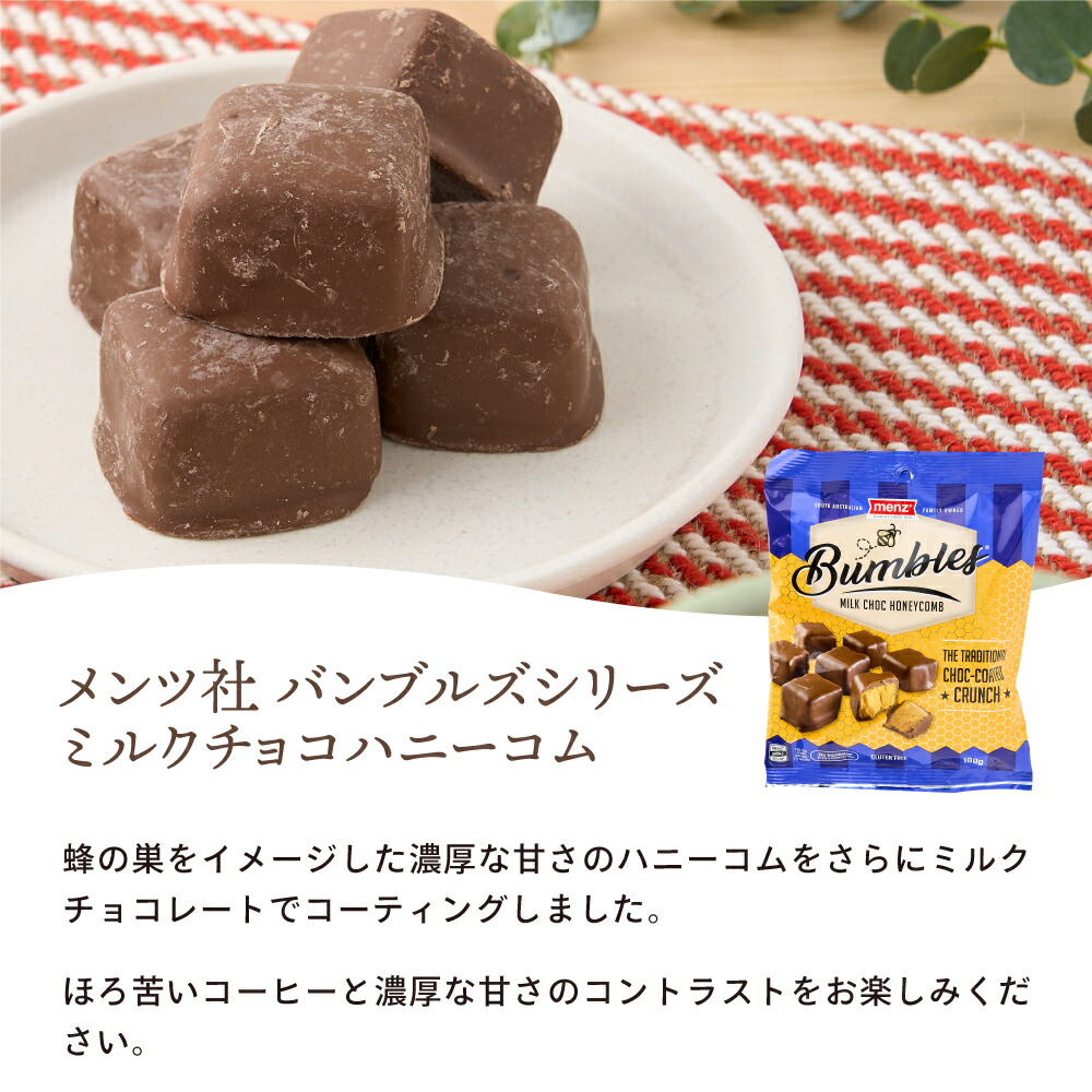 「メンツ社 バンブルズシリーズ」は、見た目が蜂の巣(ハニーコム)に似た独特の形とサクサクとした食感が特徴です。オーストラリアの老舗お菓子メーカー、メンツ社が作ったこのお菓子は、濃厚な甘さと軽い食感が絶妙なバランスを持っています。種類はミルクチョコ、キャラメル、ダークチョコの3種類。どれもコーティングされたチョコがしっかりとしていて、サクサクの中に甘さが広がります。