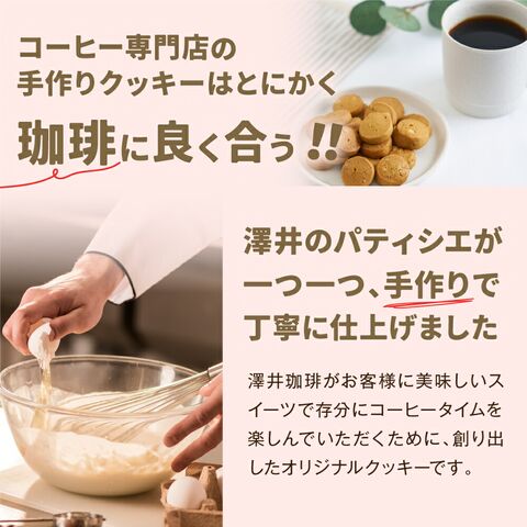 | 澤井珈琲の手作りクッキーは、甘くておいしいスイーツで、コーヒーと一緒に最高のひとときを楽しめる商品です。 1. 一つ一つ丁寧に手作りされた特別な味わい パティシエが一枚一枚手作りで焼き上げる特別なスイーツなため、既製品にはない温もりとこだわりが詰まっており、使われている素材の品質も高く、安心して食べられます。 2. 3種類のバリエーションクッキー フランボワーズの甘酸っぱい味は紅茶の香りとぴったりで、塩キャラメルはピーナッツとホワイトチョコが調和した贅沢な味わい。さらに、アールグレイのクッキーは刻んだ茶葉が食感をプラスし、風味豊かです。 3. コーヒーとの相性抜群で至福のティータイムを演出 甘さを自分好みに調整できるカフェオレベースは、忙しい朝やリラックスタイムにぴったりです。これらの組み合わせにより、どんな時でも贅沢なカフェ気分を味わえます。 | |