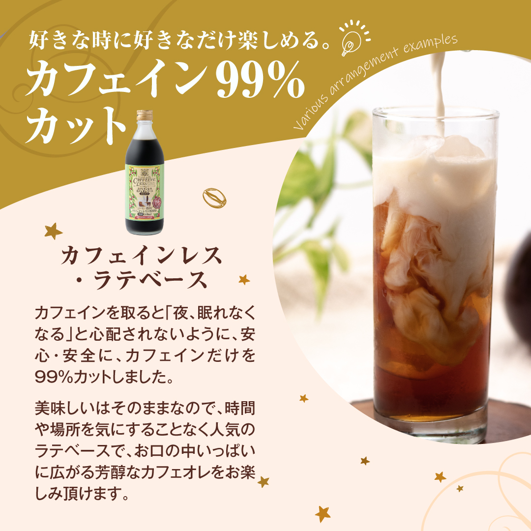 | 内容量 | ・カフェオレベース(ベーシック)500ml×1本 ・カフェオレベース(カフェインレス)500ml×1本 |