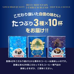 送料無料 鮮度抜群 ドリップコーヒー 30杯分 ブルーマウンテン ドリップパック 福袋 ドリップバッグ 福袋 大容量 3種 30袋 個包装 8g ×10袋 飲み比べ セット ブルマンブレンドゴールド ブルマンNo.1ブレンド プレミアムブルマンブレンド 澤井珈琲