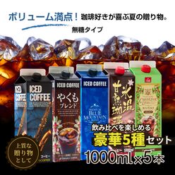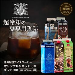 送料無料 コーヒー ギフト アイスコーヒー ギフト セット 無糖 5種 5本 セット 澤井珈琲 珈琲 1000ml 特選オリジナル ブ ブルーマウンテン やくもブレンド カフェインレス 氷温甘熟珈琲 内祝い お返し プレゼント ギフトセット 贈答品