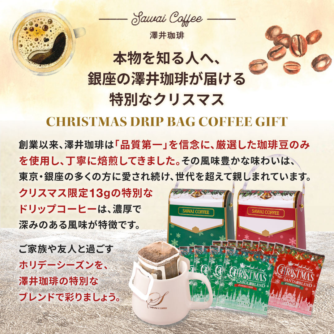 | このコーヒーは、特別な冬の季節にぴったりのクリスマス限定ドリップコーヒーです。通常の約1.5倍の量で、香り高く濃厚な味わいを楽しめます。家族や友人とのひとときを、温かく贅沢な気持ちで包み込む特別な一杯です。 1. 通常の1.5倍の満足感 クリスマス限定ドリップコーヒーは、通常のドリップバッグよりも62%多い13gのコーヒーを詰め込んでいます。この特別サイズにより、より濃厚で深い味わいが実現しました。簡単にドリップできる設計なので、初心者でも美味しいコーヒーが作れます。コーヒー好きにはたまらない、贅沢な時間を提供します。 2. 銀座のこだわり品質 創業以来、澤井珈琲は「品質第一」を信念に、厳選されたコーヒー豆のみを使用しています。香り豊かで味わい深いこのコーヒーは、世代を超えて愛される一品です。クリスマス特有の温かな気分をさらに盛り上げ、家族や友人とのひとときを華やかに彩ります。 3. 二つの特別なブレンド クリスマスサンタブレンドは、ブラジル産コーヒー豆を使用し、優しい甘みとリッチな香りを楽しめる一品です。一方、クリスマスキャロルブレンドは、フルーティーな甘さとビターな大人の味わいが広がります。それぞれのブレンドが、クリスマスらしい特別な雰囲気を演出し、家族や友人と過ごす時間をより豊かにします。 | |