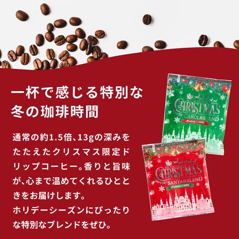 | 内容量 | ●ドリップパックコーヒー ・13Drip クリスマスサンタブレンド 13g×5袋 ・13Drip クリスマスキャロルブレンド 13g×5袋 |