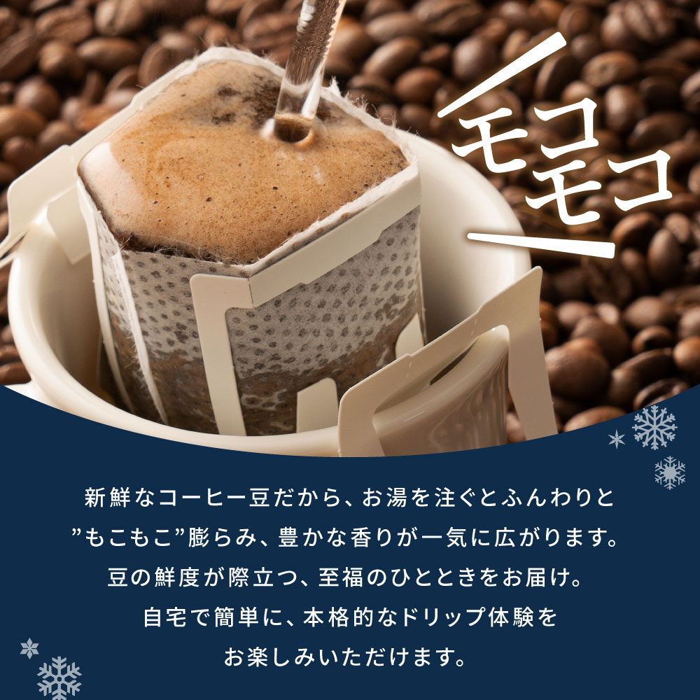| このクリスマス限定のドリップバッグコーヒーセットは、24袋も入っており、3種類の異なる味わいを楽しめます。簡単に淹れられるので、寒い冬に温かいひとときを過ごすために最適です。豊かな香りとコクで、大切な人と一緒に特別な時間を彩るギフトとしても喜ばれます。 1. 3種類のブレンドで楽しむ多様な味わい このクリスマス限定ギフトセットには、3種類の特別なブレンドが含まれています。「夜空の軌跡」は、スッキリとしたコクと程よい苦味が特徴のコーヒーで、軽やかで安らぎを与えてくれます。「聖夜の幸福」は、エチオピア産の豆をベースにした甘い香りと優しい味わいで、特別な時間を優しく包んでくれます。「聖樹の贈り物」は、深煎りの豆を使用した深いコクと香りが豊かな一杯です。これらの多様な味わいは、クリスマスの特別なひとときをさらに素敵に演出してくれます。 2. 簡単に楽しめる本格ドリップバッグ このコーヒーは、ドリップバッグ形式で提供されており、忙しい日常でも簡単に本格的なコーヒーが楽しめます。お湯を注ぐだけで、すぐにふんわりと膨らむコーヒーの粉から、豆の鮮度が際立つ豊かな香りが広がります。手軽に淹れられるにも関わらず、焙煎したてのような美味しさを楽しめるため、自宅で贅沢なカフェ気分を味わえます。コーヒーを淹れる手間が省けることで、リラックスした時間をもっと気軽に過ごせます。 3. 特別な人への贈り物に最適 このギフトセットは、華やかなデザインのパッケージに包まれており、クリスマスにぴったりな贈り物です。24袋のドリップバッグは、たっぷりと楽しめる量で、家族や友人とシェアすることも可能です。冬の寒い日に、心まで温まる一杯を大切な人と一緒に味わうことができ、贈られた人の笑顔が想像できるような特別なプレゼントです。 | |