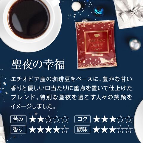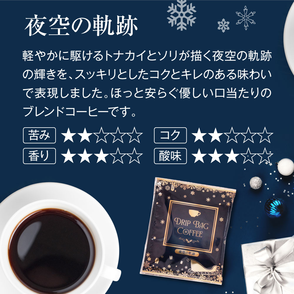 | 内容量 | ●ドリップバッグコーヒー ・夜空の軌跡 8g×8袋 ・聖夜の幸福 8g×8袋 ・聖樹の贈り物 8g×8袋 |