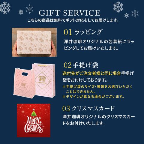 | こんな方にオススメです | 1. 贈り物としての利用 コーヒー好きな方へのプレゼントとして最適で、オリジナルのブック型の箱にお入れいたします。贈り物に迷っている方には、この商品がぴったりです。 2. 特別な日のプレゼントに この商品はクリスマス限定のギフトとなっております。大切な相手に特別感を伝えるのに適した商品です。 3. 香りを楽しみたい方 開封時の香りから淹れたときの香りまで、澤井珈琲のドリップコーヒーは豊かな香りが楽しめると好評です。 |