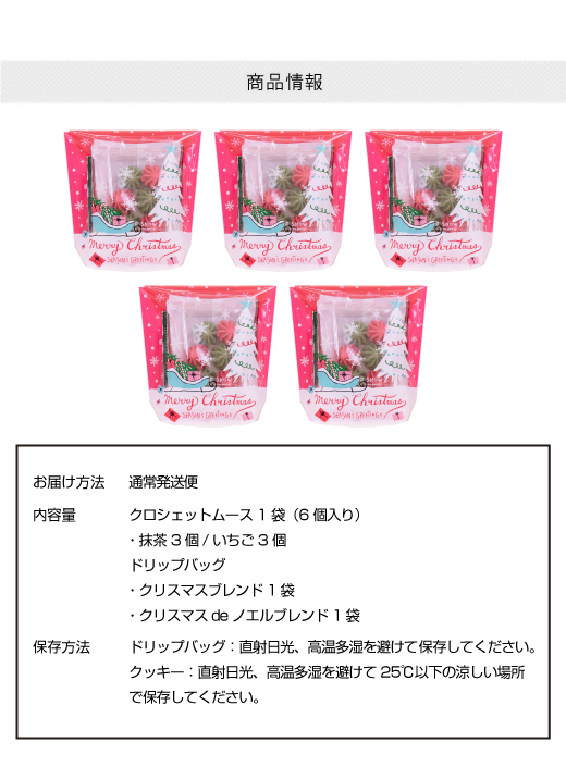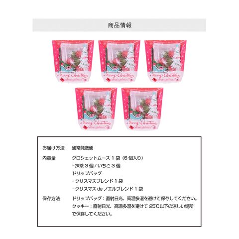 | 内容量 | 【ドリップバッグコーヒー】 ・クリスマスブレンド 8g×1袋 ・クリスマス de ノエルブレンド 8g×1袋 【クロシェットムース】 ・1袋(6個入り) 抹茶/3個,いちご/3個 上記を×【5セット】 |