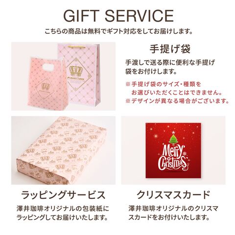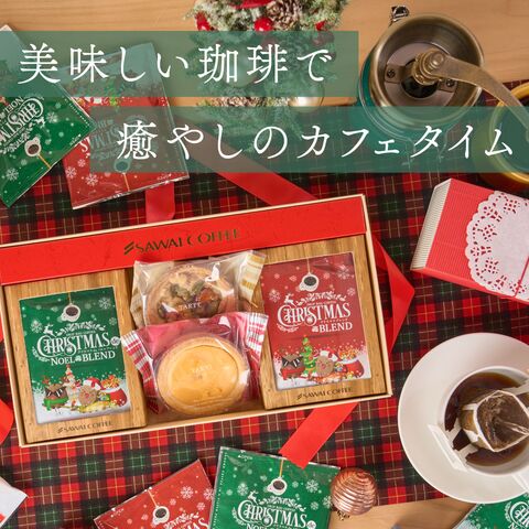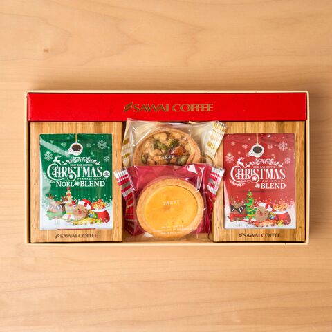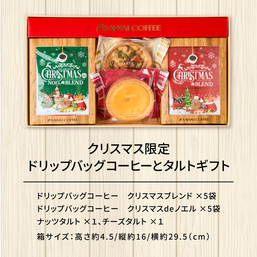 | 内容量 | ●ドリップバッグコーヒー ・クリスマスブレンド 8g×5袋 ・クリスマスdeノエルブレンド 8g×5袋 ●タルト ・ナッツタルト 1個 ・チーズタルト 1個 |